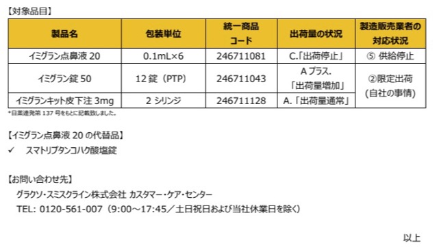 イミグラン点鼻供給停止